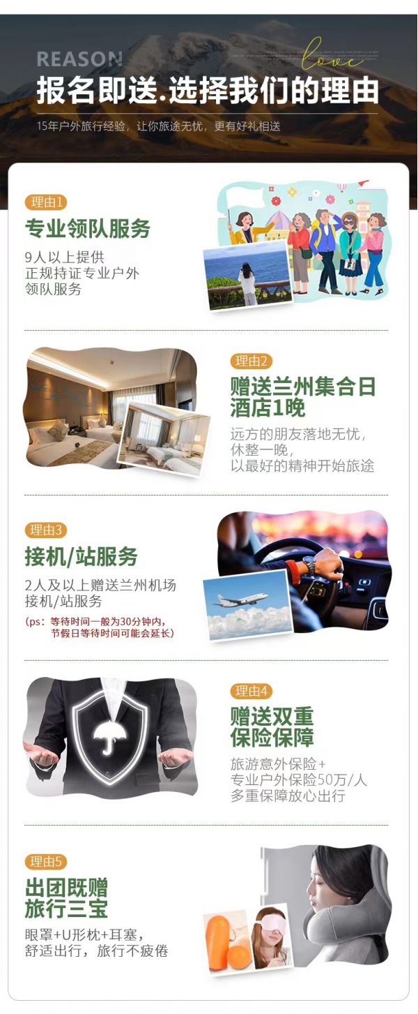(5)贈送2人及以上蘭州市區接火車服務;4人以上接機服務,23點后由于運管規定不能接機/接站,敬請諒解;服務:9人及以上,提供持證正規導游服務;8人及以下,由經驗豐富的司機帶隊,無單獨導游服務,請諒解。保險:贈送高額旅游意外保險,旅游意外保險最高賠付50萬元/人,贈送旅行社責任險,贈送車輛保險;因道路交通事故造成的客人意外傷害,按《道路交通事故處理方法》由保險公司賠償,我方不承擔另外的賠償責任;如有需要,游客可自行購買其他保險。