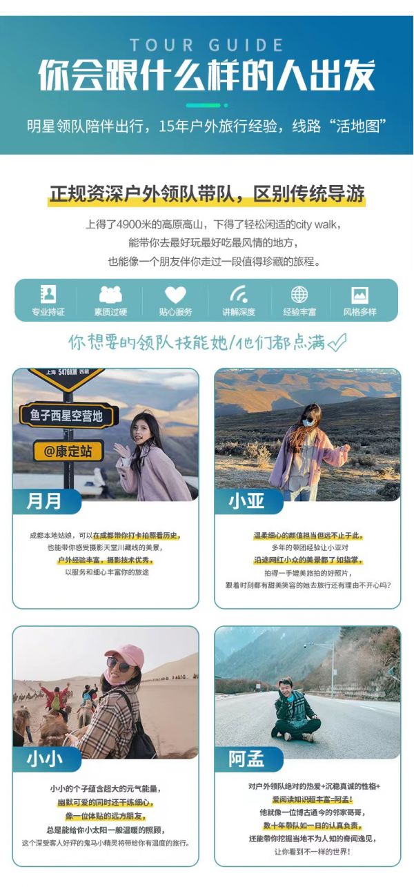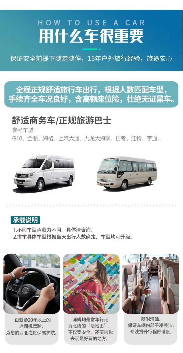 服務(wù):8人以上提供正規(guī)持證專業(yè)戶外領(lǐng)隊(duì)服務(wù);8人及以下由經(jīng)驗(yàn)豐富的司機(jī)提供向?qū)Х?wù)。