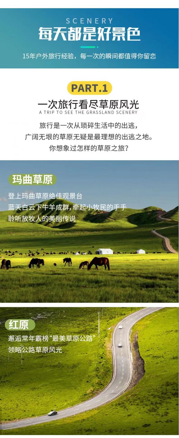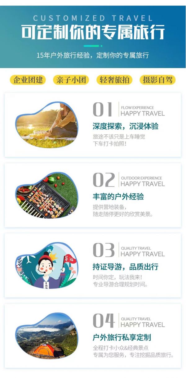 私人訂制:我們業(yè)務(wù)范圍囊括了全國各大城市,川西、西北、西藏、新疆,在路上永遠(yuǎn)有我們的身影。我們將為每一個(gè)有定制需求的你策劃出獨(dú)屬于自己的完美旅行。