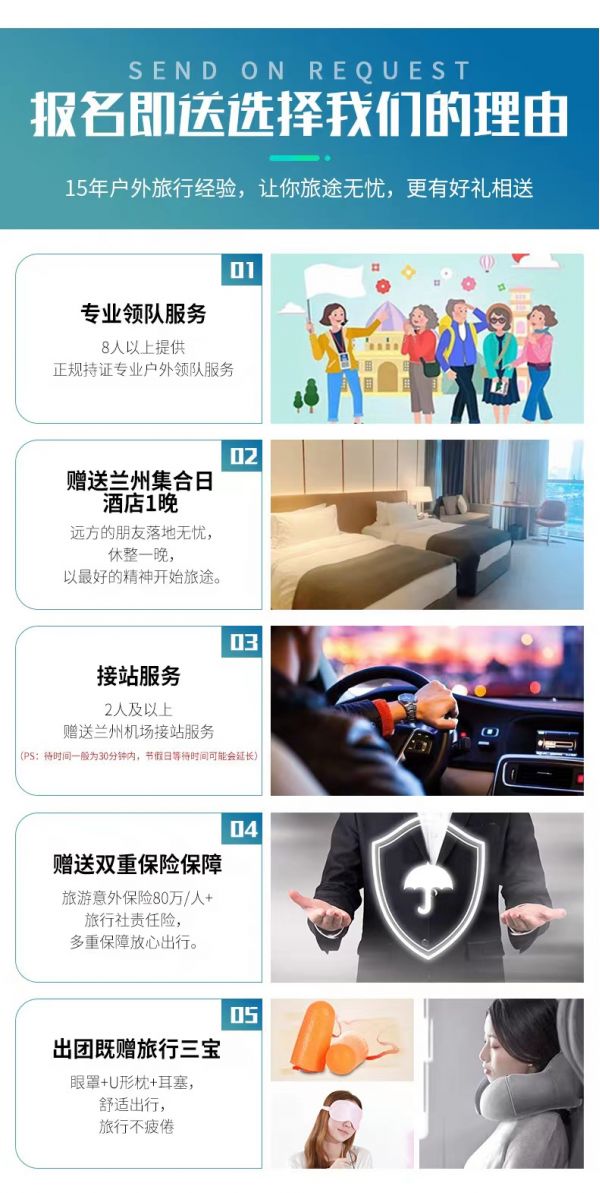 接站服務(wù):2人及以上免費(fèi)提供蘭州市區(qū)拼車接火車服務(wù),接火車的工作人員會(huì)在您出發(fā)日期前一天21:30之前向您推送消息并與您聯(lián)系,如果超過時(shí)間沒有接到任何通知,請及時(shí)與領(lǐng)隊(duì)或報(bào)名處聯(lián)系。(節(jié)假日用車人數(shù)較多情況下客人等待時(shí)間可能會(huì)延長;我方會(huì)安排臨近航班拼車接站,如遇其他客人航班火車延誤晚點(diǎn)情況,等待時(shí)間可能會(huì)延長,敬請諒解)