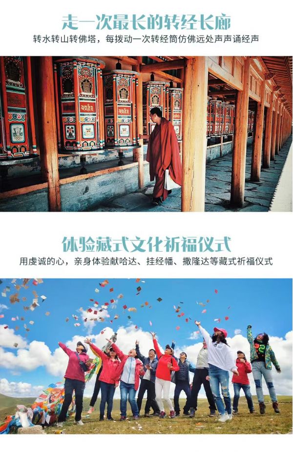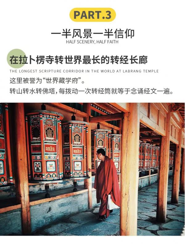 繼續(xù)往前【拉卜楞寺】,有“世界佛學(xué)院”之稱的【拉卜楞寺】。拉卜楞寺是藏傳佛教格魯派六大宗主寺之一 , 規(guī)模僅次于布達(dá)拉宮,是藏傳佛教格魯派最高佛學(xué)學(xué)府之一,被世界譽(yù)為“世界藏學(xué)府”,相當(dāng)于我們眼中的“清華北大”。在漫長的發(fā)展中拉卜楞寺形成了獨(dú)特的藏傳佛教文化,包括建筑、學(xué)院、法會(huì)、佛教藝術(shù)、藏經(jīng)等,曾經(jīng)是甘、青、川毗鄰地區(qū)藏族的政治、宗教、文化中心。在學(xué)院堪布的帶領(lǐng)下來,進(jìn)入寺院,欣賞美麗的壁畫、唐卡,精美佛像;走過朱紅玄黃長廊,和喇嘛一起撥動(dòng)轉(zhuǎn)經(jīng)筒;在這紅白相間的宏偉寺院中,看虔誠的信徒磕著等身長頭來此轉(zhuǎn)經(jīng);與僧人一起聽經(jīng)、打坐,靜靜感受這份信仰的力量。而后經(jīng)過【瑪曲】,母親河黃河這里自西南入境,復(fù)從西北出境。