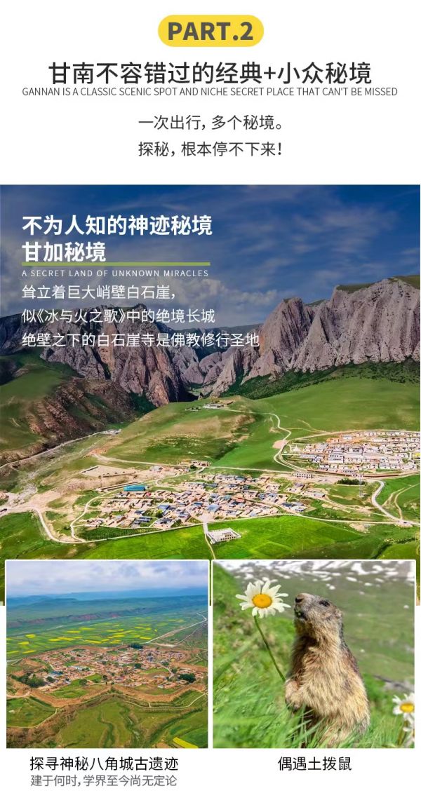 而后我們將進(jìn)入一個(gè)真正的世外桃源——【甘加秘境】。這里集中了白石崖寺、白石崖巖洞、八角城等眾多古跡。甘家草原的盡頭,是一座高聳入云,綿延十余公里的巨大峭壁---【白石崖】。它宛如一道屏障守護(hù)著下方的甘加草原,既似《冰與火之歌》中的絕境長城,又有魔戒里中土世界的蒼遠(yuǎn)和神秘。而位于白石崖絕壁之下的白石崖寺,則是安多藏區(qū)著名的佛教修行圣地。【八角城古遺跡】建于何時(shí),學(xué)界尚無定論,目前有漢置白石縣舊址、西夏所建、角廝羅(宋代青唐吐蕃首領(lǐng))所建幾種說法,是歷代中央政權(quán)與吐谷渾、吐蕃、西夏等地方政權(quán)激烈爭奪的軍事要塞。在甘家秘境途中還能偶遇可愛的土撥鼠~
