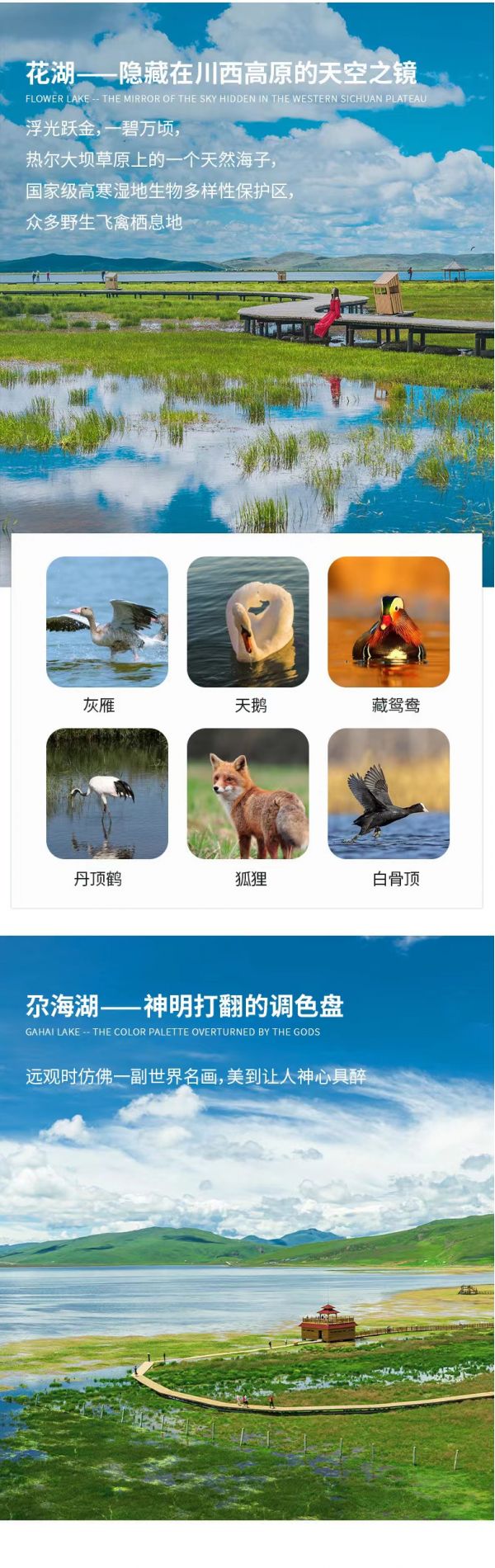 然后我們前往草原湖泊【花湖】。在僅次于呼倫貝爾草原的熱爾大壩草原之上,有一個(gè)絕美的天然海子---花湖。花湖濕地屬于國家級高寒濕地生物多樣性保護(hù)區(qū),是眾多野生飛禽的主要棲息地,如灰雁、白骨頂、天鵝、黑頸鶴、丹頂鶴、藏鴛鴦、狐貍等。花湖的夏天和秋天別有一番風(fēng)味。夏天,號稱“天空之境”的花湖,周邊開滿野花,美輪美奐。秋天,廣闊的草原變成一片金黃,藍(lán)色的花湖被包圍其中,仿佛金色地毯上的一顆藍(lán)寶石。湖邊建有木質(zhì)棧道,一直延伸到水中,可以沿著棧道走到濕地深處,沿途都可以找到拍大片的好角度。