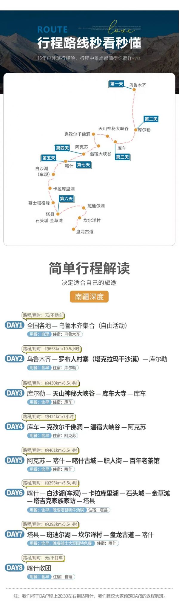 當天車程較長,從北疆穿越天山甘溝進入南疆腹地,氣候變化較大,請適當增減衣物,注意補充水分。可提前購買一些零食,以備不時之需。