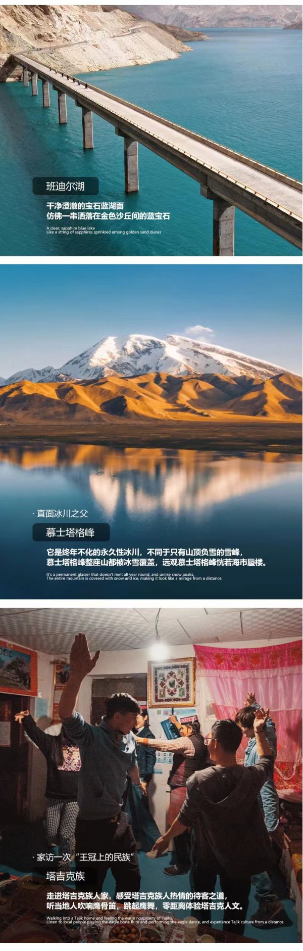 告別“東方摩洛哥”—喀什,我們將開啟一段帕米爾高原之旅。沿314國道一路暢游帕米爾高原風(fēng)光,首先驚艷我們的是背靠白色沙丘和雪山的【白沙湖】,在陽光的變化下,湖水時而呈湛藍色,時而呈綠色。更令人驚嘆的是,藍色的湖面與白沙相接,一半藍一半白,而白沙背后還有雪山。在雪山和白沙的映襯之下,白沙湖水更顯澄澈。在這里能get湖泊、白沙、雪山同框的畫面。分享一個冷知識:白沙湖又名流沙河,就是西游記里唐僧收服沙和尚的地方。我們還能途觀慕士塔格峰,山頂常年皚皚白雪,猶如滿頭白發(fā),十余條冰川鑲嵌在峰體下的峽谷中,如胸前飄動的銀須,故有“冰山之父”的美稱。隨后我們將遇見【卡拉庫里湖】,這里能看到雪山倒映在湖面的風(fēng)景,拍出來的照片特別的給人純凈的感覺。