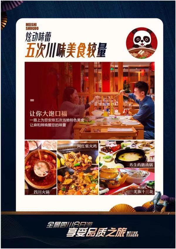 3.游覽結束后前往入住酒店,晚餐贈送特色四川火鍋,讓您品嘗四川火鍋的麻,辣,鮮,香,輔以四川特色名小吃,晚餐后贈送觀看集川劇變臉、峨眉武術、歡樂彝家等絕技 60 分鐘的演出。