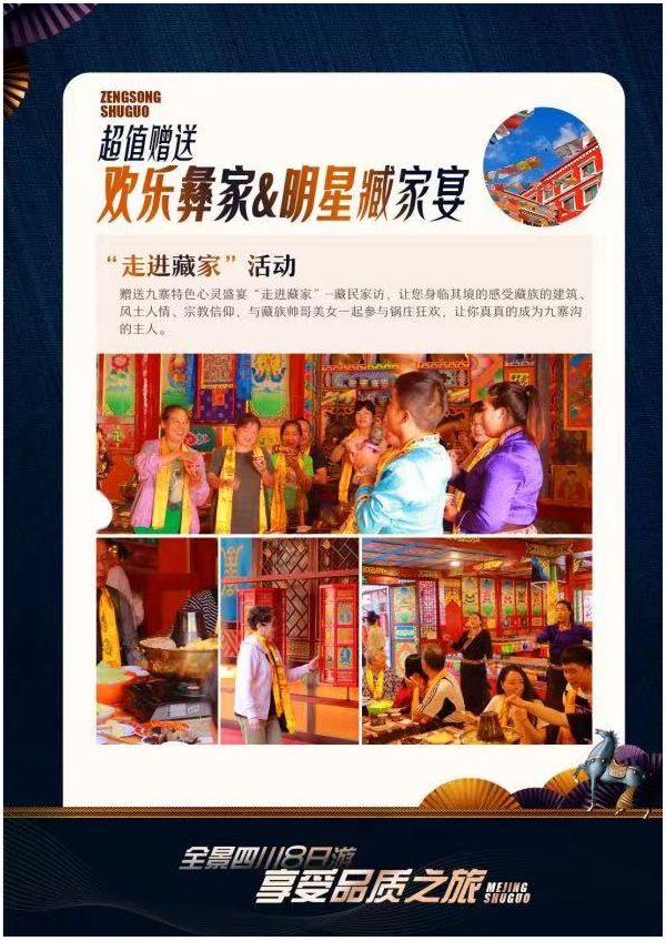 2.晚贈送九寨特色心靈盛宴“走進藏家”--藏民家訪,讓您身臨其境的感受藏族的建筑、風土人情、宗教信仰,與藏族帥哥美女一起參與鍋莊狂歡,讓你真真的成為九寨溝的主人。大家圍成一個圈,吃吃喝喝,再看看表演,可以品嘗到九寨溝具有特色美食:藏家土火鍋(此項目為贈送,如若不參加,旅行商不能退還門票費。)
