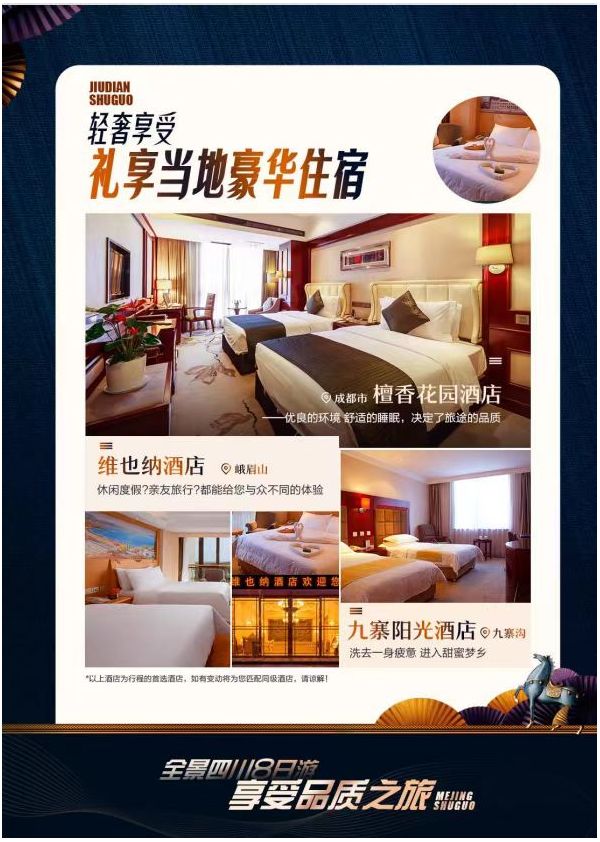 【酒店】:成都四晚酒店住宿,九寨溝二晚酒店住宿,峨眉山一晚酒店住宿,每人一個床位,如有損壞或房間內個人消費,敬請自理。行程所列酒店住宿,每人一個床位,,如有損壞或房間內個人消費,敬請自理。每人1床位。2人以下單床位的,必須補房差,3人以上可補房差亦可安排加床(加床為鋼絲床或床墊)或三人間(部分酒店無三人間)以酒店提供為準,費用同正常床位;不提自然單間和拼房服務,亦不接受樓層及特殊房型指定;因計劃用房,房差需于出行前團款中付清;行程內酒店住宿押金均為游客自付自退住宿酒店已列出,敬請百度,如行程提供標準無法滿足您對酒店的要求,請更換其它更高標準的產品。酒店未達到個人住宿標準的不屬于旅游行程質量范疇。遇特殊原因(如天氣,交通,地面,酒店接待能力),我公司會依當時情況調整行程中標明的備選酒店,但不會安排行程中未涉及到的酒店,也不會影響游客的行程安排。