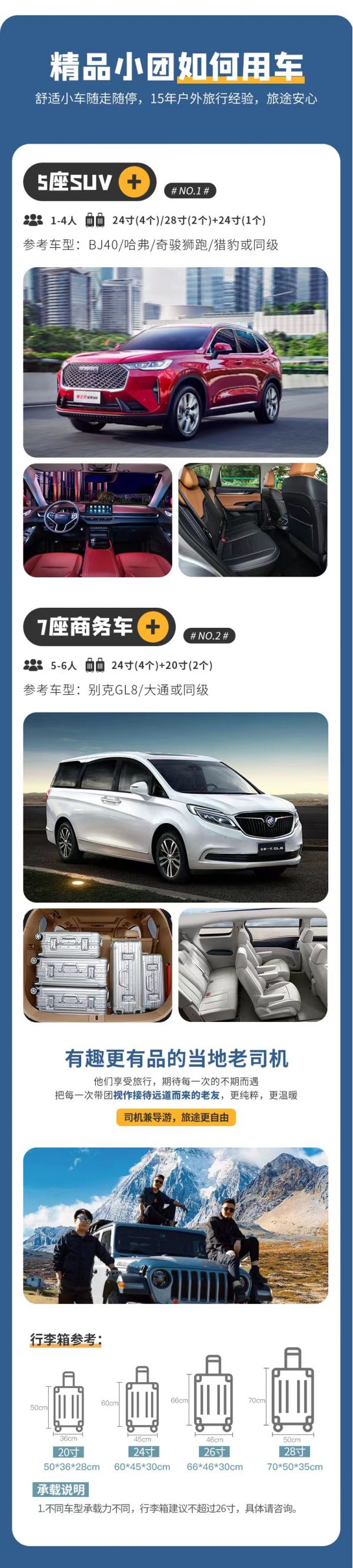 交通:2-6人VIP私享小團全程舒適SUV/商務車出行;車型大小根據實際人數安排,且由駕駛經驗豐富的司機為您的出行保駕護航,報價包含車費、油費、停車費、維修費及司機勞務費。