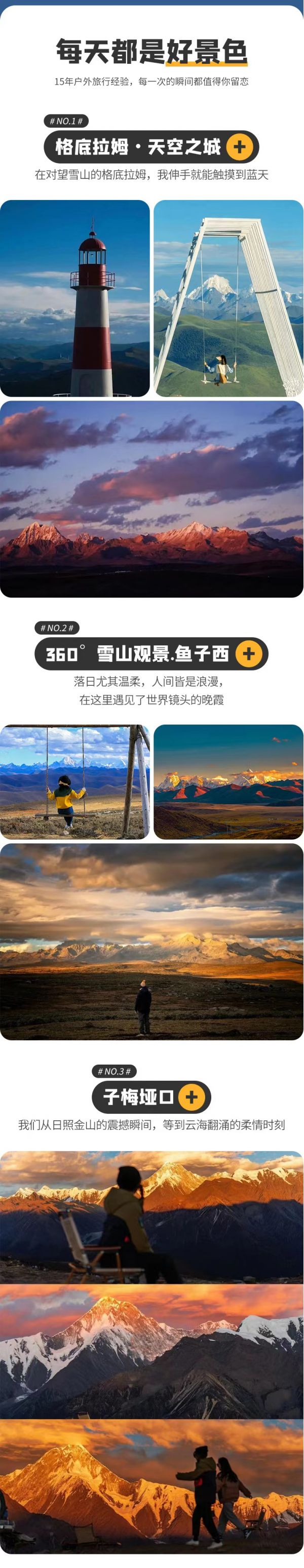 2、若格底拉姆·天空之城、魚子西因下雪或者管制需要中轉車進入,費用自理。若領隊陪同上山,中轉車費客人負責AA。如果魚子西森林防火期間則取消,在格底拉姆看日落。