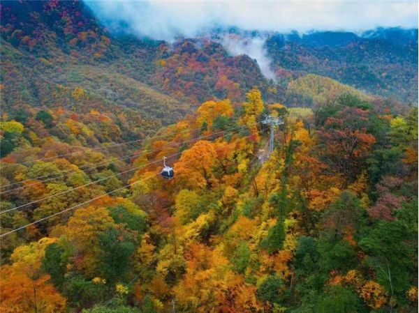 秋天的紅葉谷宛若童話世界,4000余畝黃櫨樹換上新裝,如云似霞。登上萬葉塔俯瞰整個景區,漫山遍野的紅葉從山頂蔓延開來,勾勒出一幅絕美的紅葉畫卷。漫步在環秀路,道路兩旁鋪滿了紅葉,層林盡染的紅葉風光,令人心醉,讓游客們流連忘返。