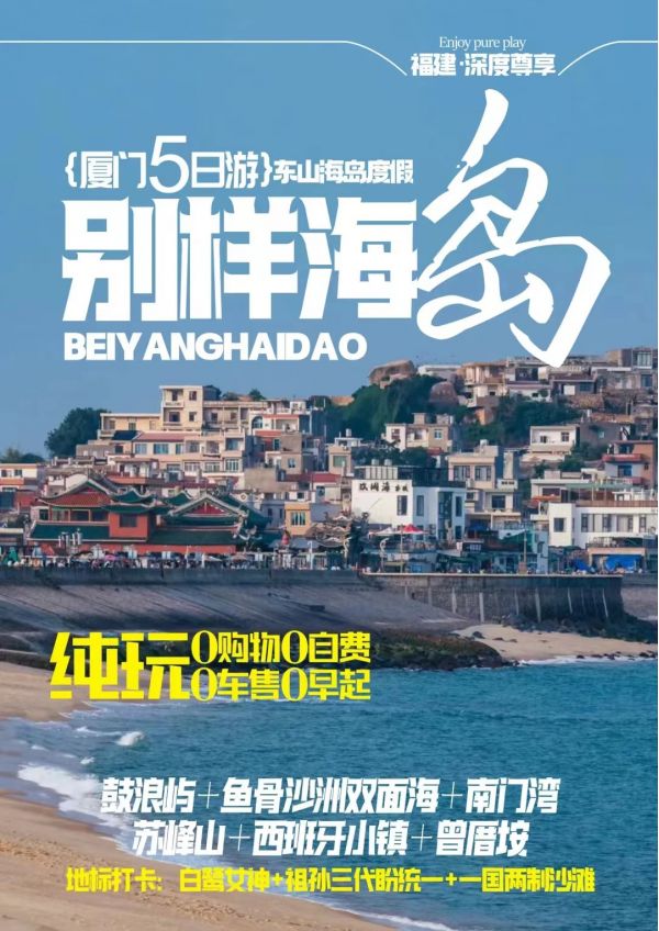 廈門、夜宿鼓浪嶼、旅拍鼓浪嶼、東山島魚骨沙洲雙面海、西班牙卡達凱斯小鎮深度游雙飛五日(行程供參考,導游在不減少景點的情況下會根據實際情況相應調整游覽順序)