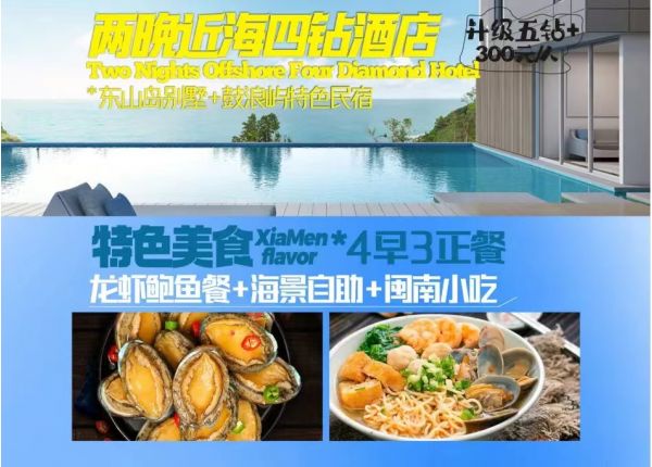 午餐前往品嘗東山島地道海鮮餐:前往餐廳,享用東山島海鮮大拼盤。 這幾年東山海鮮,在廈門已經變成了鮮美、海產豐富的代名詞了。東山一年四季海鮮源源不斷,而且種類繁多。地道 的海鮮烹飪技巧,多道美食激發你的食欲,滿足你的味蕾。