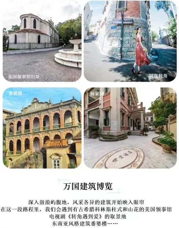 網紅打卡拍照點:①「最美轉角」②「曉學堂·蟲洞書店」③「協和禮拜堂」④「天主教堂-萬國領事館建筑博覽」⑤「怡園-林鶴年故居」