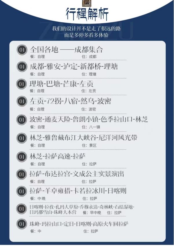 成都—雅安瀘定—新都橋--理塘-巴塘—芒康—左貢--72拐--八宿—然烏—波密--通麥天險--魯朗小鎮--色季拉山口--喬穆永青--奇林峽--定結濕地--日瑪那雪山--珠峰大本營--林芝-雅魯藏布大峽谷--尼洋河風光帶--林拉高速--拉薩-布達拉--宮羊卓雍措--卡若拉冰川--日喀則--拉孜--孔瑪大草原
