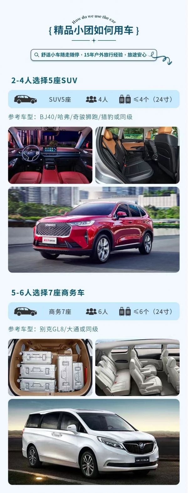 交通:2-8人VIP私享小團,全程舒適商務車出行,車型大小根據實際人數安排,保證一人一正座位,且由駕駛經驗豐富的司機為您的出行保駕護航,報價包含車費、油費、停車費、維修費及司機勞務費。住宿:行程所列6晚住宿。我們會提供行程內展示照片的酒店或其他條件相似酒店,但因沿途條件有限,如酒店設施達不到您的期望,請您諒解。