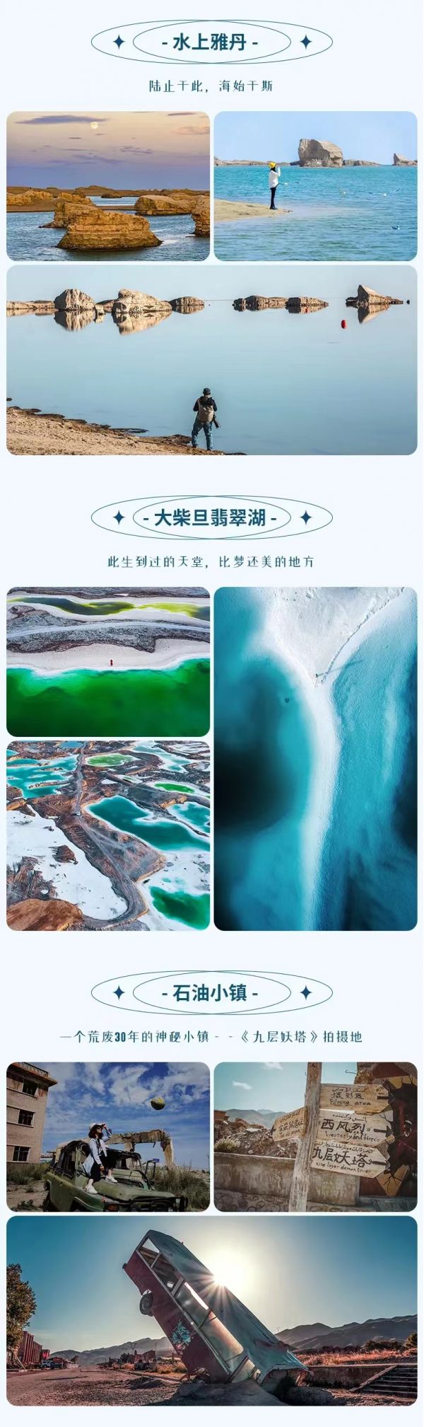 青海湖+茶卡鹽湖+穿越柴達木盆地+U型公路+水上雅丹+大柴旦翡翠湖+阿克塞石油小鎮+莫高窟+鳴沙山月牙泉+嘉峪關關城+張掖七彩丹霞+祁連大草原