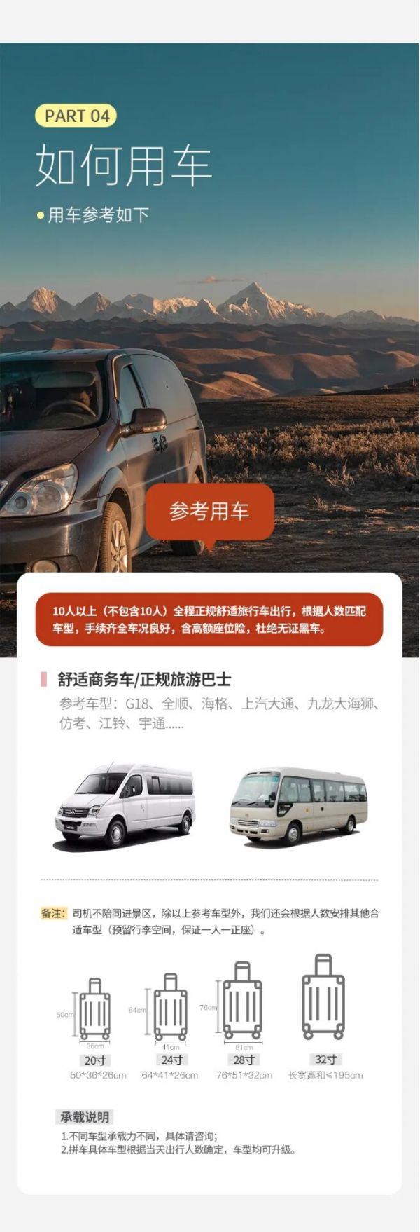 用車:車型根據人數決定,保證每人一正座;包含司機一名、油費、過路費、停車費,包含從出發地到景點及酒店費用,不包含晚間自由活動交通;