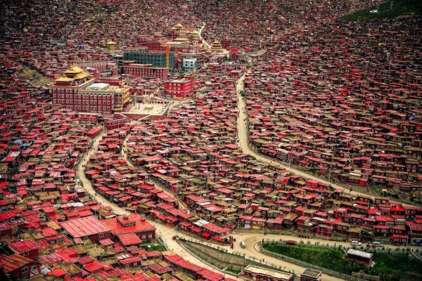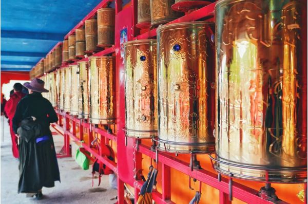 ? 震撼的佛國畫卷逐漸展開--入目處盡是朱紅的佛色,裹著紅袍的僧人在其間穿行,空氣里彌漫著佛香。在金紅相間的佛學院漫步,學著僧人面目虔誠地轉經、朝拜,在觸動轉經筒的旋轉中,感受“信仰”的具象化。