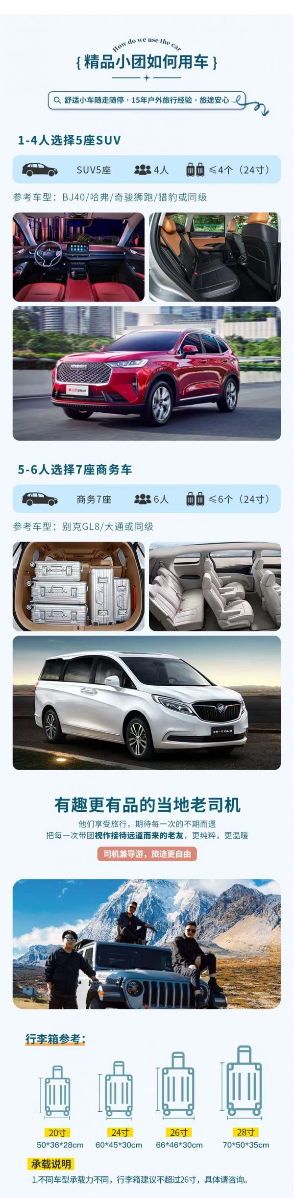 交通:2-8人VIP私享小團,全程舒適商務車出行,車型大小根據實際人數安排,保證一人一正座位,且由駕駛經驗豐富的司機為您的出行保駕護航,報價包含車費、油費、停車費、維修費及司機勞務費。