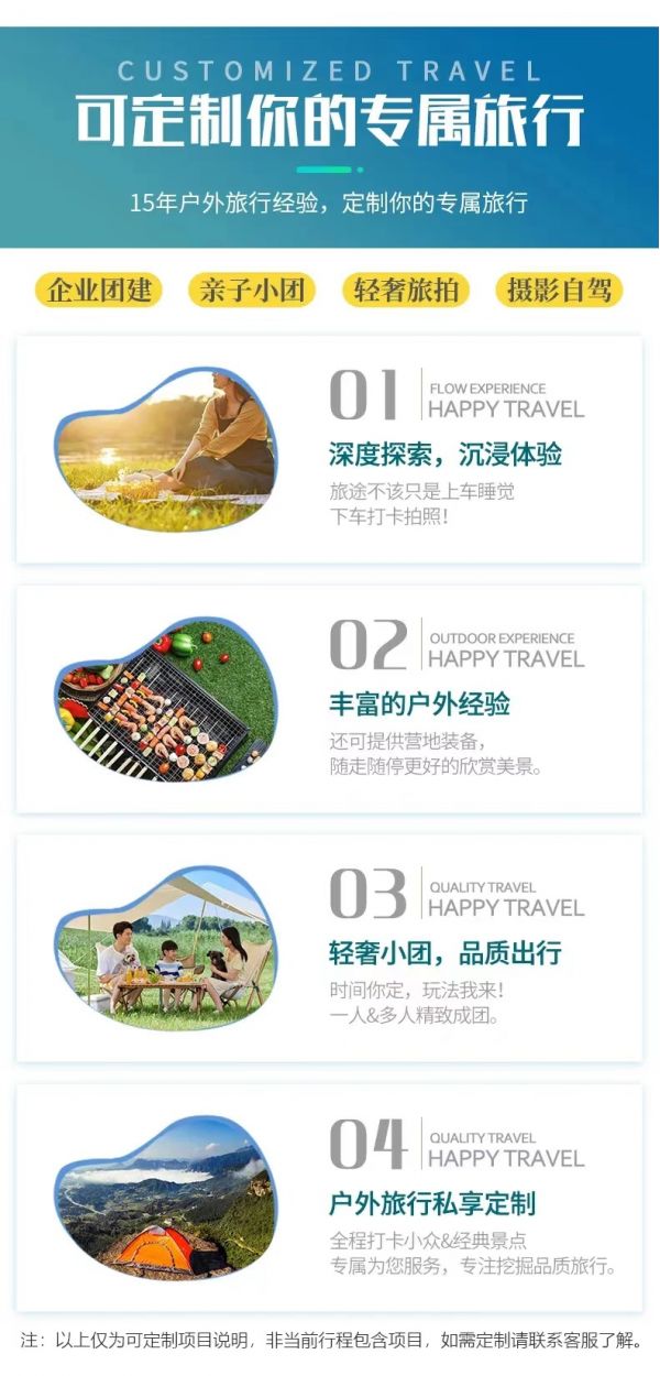 私人訂制:我們業務范圍囊括了全國各大城市,川西、西北、西藏、新疆,在路上永遠有我們的身影。我們將為每一個有定制需求的你策劃出獨屬于自己的完美旅行。