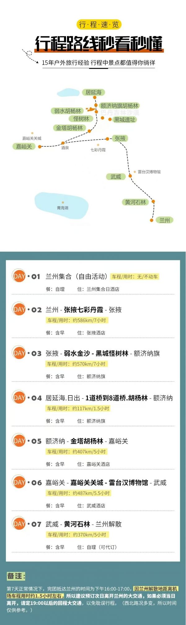 備注請對應使用我額濟納7日行程,因使用其它行程造成的投訴,責任自負;請仔細閱讀以上行程文檔,同意并保證遵守我方安排,以免為您帶來不必要的麻煩;如產生合同糾紛或人身意外事故,按《中華人民共和國合同法》、《道路交通法》、《保險賠償條例》裁定;本行程作為旅游合同附頁與旅游合同同等法律效力。