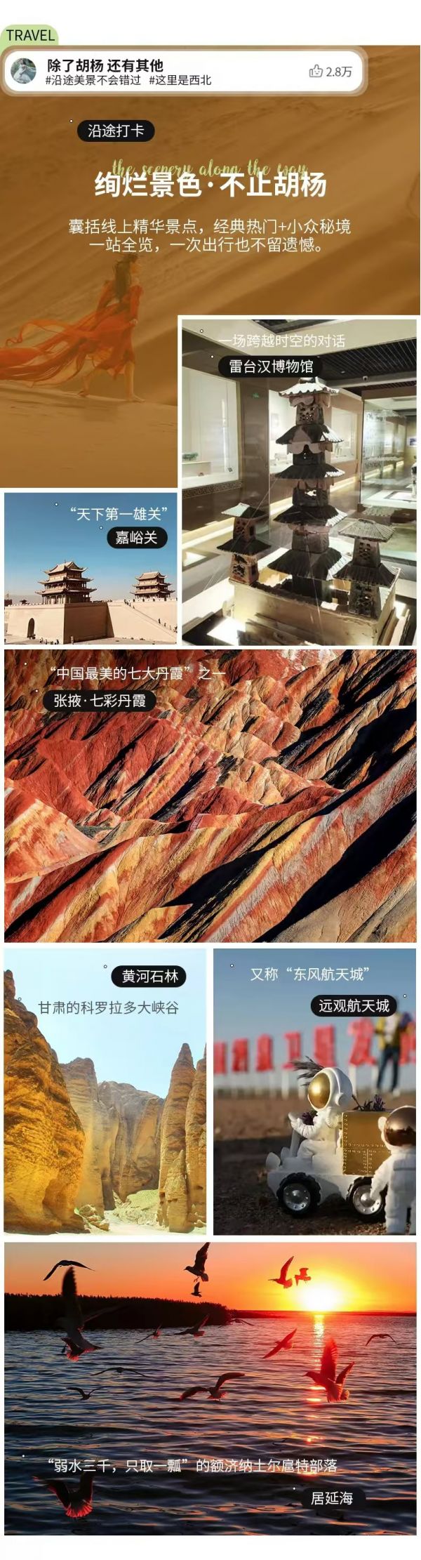 ● 門票:額濟納胡楊林(門票+景交車);黑城弱水怪樹林景區(門票+景交車);金塔胡楊林(門票+景交車);居延海(門票+景交車);張掖七彩丹霞(門票+景交車);嘉峪關關城(首道大門票);黃河石林套票(門票+往返大巴車+往返電瓶車+全景觀光車)