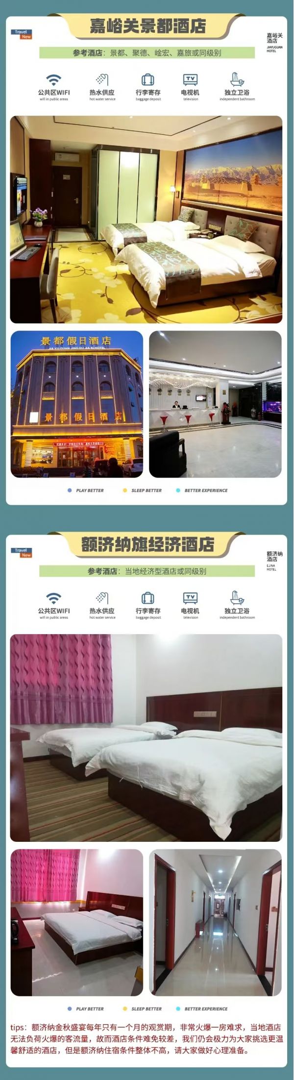 溫馨提示:西北晝夜溫差較大等地域問題,大部分酒店都沒有空調,請提前有心理準備。