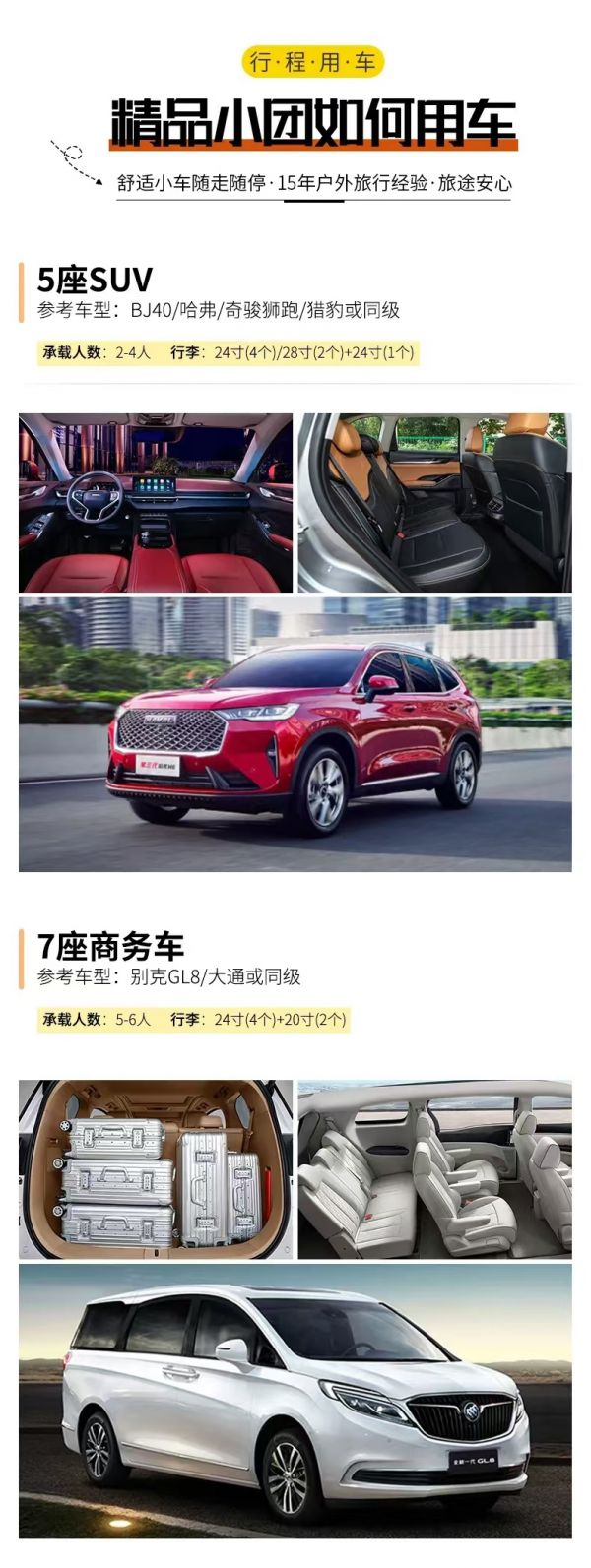 ● 交通:VIP私享2-8人小團,全程商務車/越野車出行,保證一人一正座位,車型大小根據實際人數安排,且由駕駛經驗豐富的司機為您的出行保駕護航,報價包含車費、油費、停車費、維修費及司機勞務費。