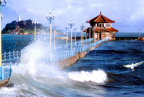 棧橋是青島的象征。位于青島灣中,與市內最繁華的中山路成一條直線,由海岸前伸入海,素有“長虹遠引”之美譽。棧橋初建于光緒十八年(公元1892年),是青島最早的碼頭。經1931年改建和1985年整修,現寬8米,全長440米。版權所有山東聊城聊之旅國際旅行社有限公司,轉載必究!橋南端筑半圓形防波堤,堤內是一座具有民族風格的兩層八角亭,金瓦朱壁,盔頂飛檐,題名“回瀾閣”。棧橋劃波斬浪,像一條長龍橫臥于碧海銀波。循橋漸入,仿佛走進大海的懷抱;佇立閣旁,層層巨浪澎湃涌來,拍打堤壩,擊起萬千碎玉;入閣內,沿螺旋樓梯登到樓上,四周盡是寬敞的大窗,放眼望去,又是另一番怡人風景,“飛閣回瀾”因此被譽為“青島十景”之一。