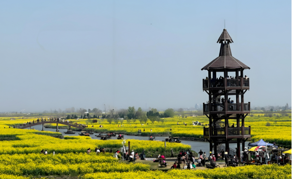 早上我們前往“中國最美的油菜花海”──【千島菜花風景區】,千島菜花景區被稱作“中國最美的水上油菜花”三月至四月便是此最美的季節,座落在河網縱橫的缸顧鄉,一條條的小河又分支出一條條的小溝,南北東西延伸開去,把一整塊的田分列割成了千百個“小島”,這種“小島”興化人把它稱作“垛”。垛子只比水面高出一點點,整齊劃一地排著,就像是列隊檢閱的方陣,氣勢恢宏,波瀾壯闊,登上20多米高的觀光瞭望臺,極目遠眺,滿眼盡是金黃色的菜花,形成一道獨特的自然風景,身臨其境,心曠神怡;