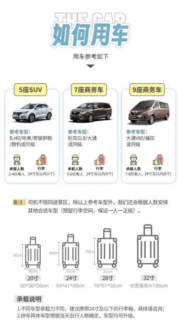 為保證成團(tuán)及質(zhì)量,根據(jù)人數(shù)派不同座位數(shù)用車,保證每人一正座;