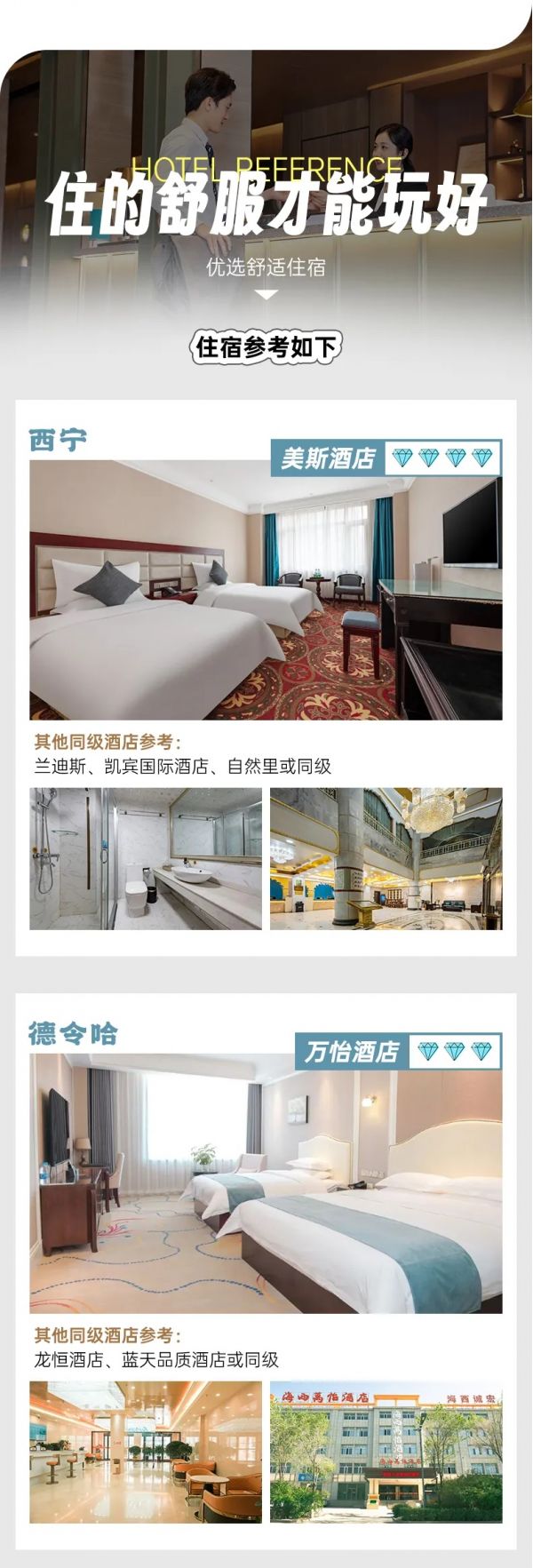 住宿:行程所列住宿地6晚住宿,每人1床位(含西寧集合日4鉆酒店1晚、不住不退不換不指定)具體了解團(tuán)期價格。