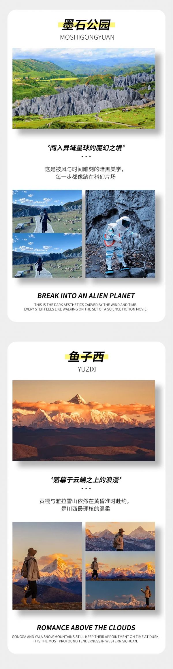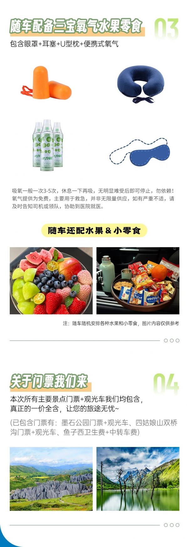 門票:包含墨石公園門票+觀光車、四姑娘山雙橋溝門票+觀光車、魚子西衛生費+中轉車費(原車中轉不去不退費)