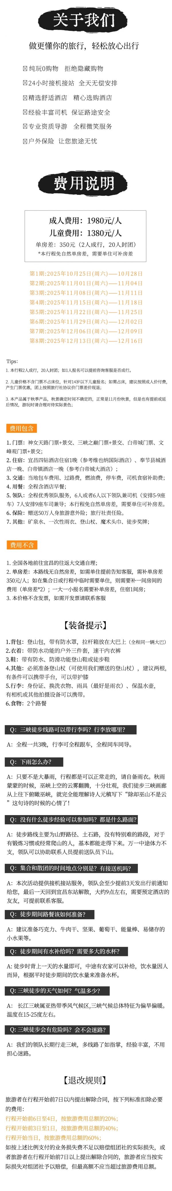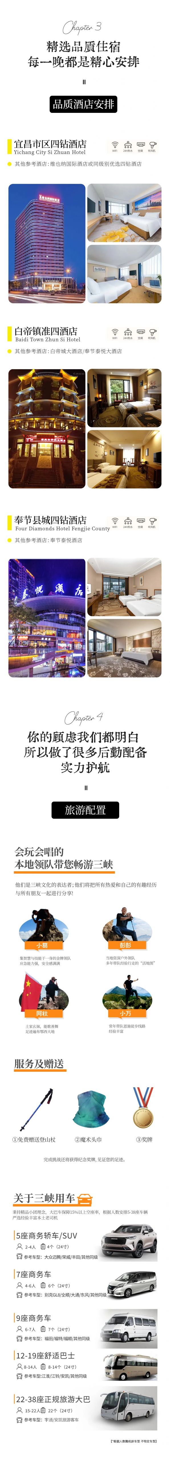 A:本次活動提供接機接站服務,領隊會至少提前3天發出行前通知給您,最后一天回到宜昌東站解散,大約9點左右,需要預定酒店的友友,可提前聯系客服