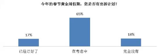 距2015年春節黃金周假期只有1個多月了,調查顯示,有出行意愿的網民達到八成。17%的網民已經訂好了出游計劃,65%的網民仍在考慮中。18%的客戶表示沒有出游計劃。