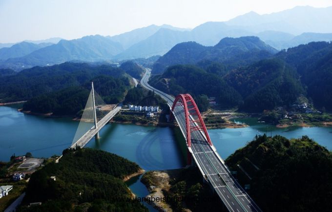 太平湖上,因為G205國道和G3京臺高速跨湖的需要修建了2座大橋,位于G205國道上的為斜拉索大橋,而G3高速上大橋為中承提籃結構。