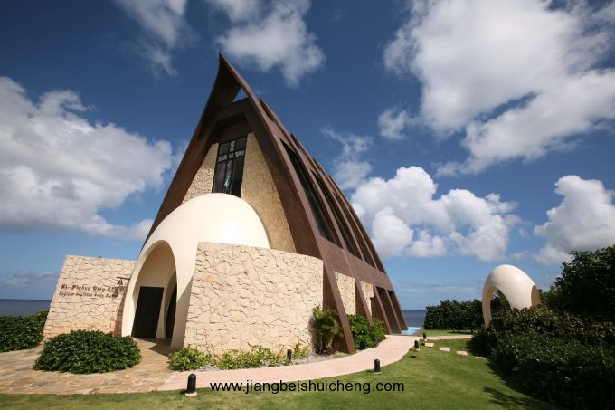 有近2000粒大小不同的施華洛世奇水晶從天花板垂下來(lái),在陽(yáng)光長(zhǎng)年普照的關(guān)島,加上海水的折射,令教堂內(nèi)不斷閃耀著不同的顏色。全白色的墻加上藍(lán)白色的玻璃窗,整個(gè)教堂就像一座水晶宮。
