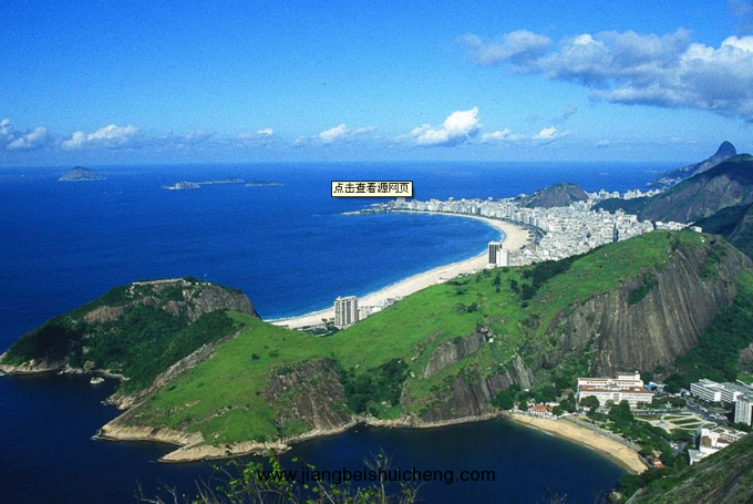 遠處,一條長龍飛架海灣兩岸,那是著名的尼泰羅伊大橋。這座大橋全長十四公里,把里約與對岸的尼泰羅伊市連結(jié)在一起;這一邊是浩如煙海的大西洋,波光粼粼的海面上不時地駛過巨大的海輪,三三兩兩形狀各異的小島在海浪潮水的拍擊下,時隱時現(xiàn)。遠處,科帕卡巴納海灘像一彎新月,橫臥在大西洋身旁,五顏六色、南來北往的小汽車宛若無數(shù)的甲殼蟲在月牙般的海濱大道上緩緩爬行……