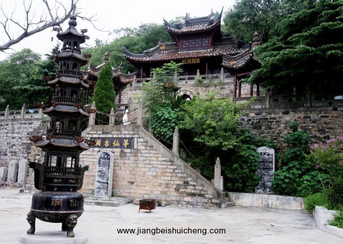 洞前建有兩層磚木結構的正殿一座,殿寬三間,飛檐翹角,額懸“茅仙古洞”四字木匾,殿旁建有六角涼亭;洞附近有大禹治水處、劉安瘃冉井、壽塘關等名勝古跡。