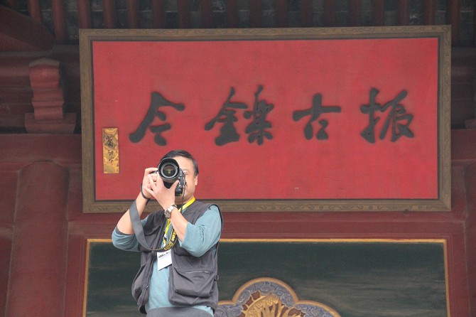 照壁的背后是他書寫的“忠、義、仁、勇”四個大字,成為會館一景,不少游人在此駐足留影紀念