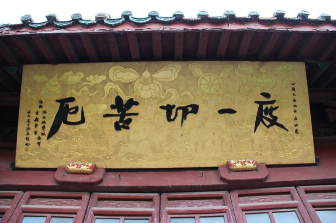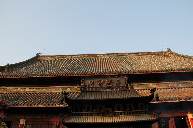 大雄寶殿重檐斗拱,雕梁畫揀,金碧交輝,其內(nèi)供奉有釋迦摩尼、阿彌陀佛和藥師佛三世佛,均高一丈三尺,其后是大型雕塑海島觀音,取材于《華嚴(yán)經(jīng)》善財童子53參的故事,形象地表現(xiàn)出南海觀音普渡眾生的場面,東西兩壁供奉的是十八羅漢。