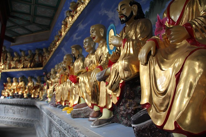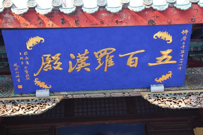 殿內(nèi)回廊中有大型群像“釋迦牟尼講經(jīng)會”,五百羅漢姿態(tài)各異,造型生動,他們或在山林之中,或在小橋流水間,或坐或臥,或仰頭,或俯首,形態(tài)逼真,情趣無限,堪稱藝術(shù)杰作。