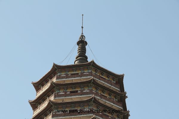 新塔是在舊塔原址上于2006年5月19日動工建設(shè),為8面13層,通高90米,重建修造了地宮。第13層修蓮花寶頂,寶頂下是4尊面向東西南北的四面佛,四面佛周圍是18羅漢。13層外廊墻壁設(shè)計了108個佛龕。佛龕對面的墻壁上是4大菩薩壁畫。