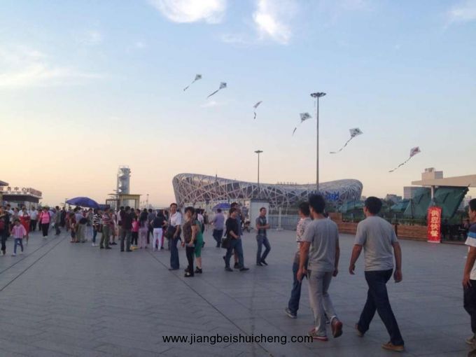 看天空,自由自在的風(fēng)箏在鳥(niǎo)巢上空飛翔