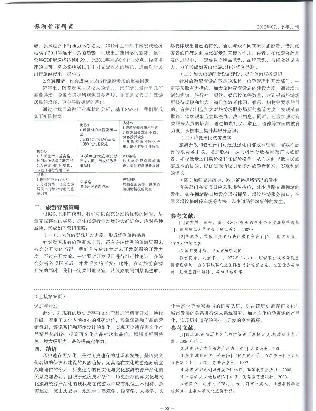 聊之旅旅行社董事長劉寶平發表文章《基于SWOT分析的旅游營銷策略分析》刊登在國際級刊物《旅游縱覽》2012年7月版。