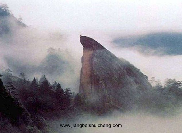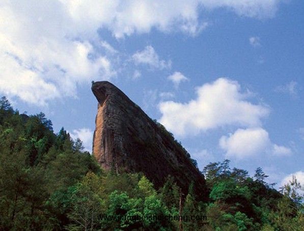 從天車架往西行約數(shù)百米,便可看見一座形似雄鷹的巨巖。“雄鷹獨(dú)立健無倫,銳喙昂頭實(shí)逼真。豈是神山厭凡鳥,欲君奮擊絕器塵”。形象、生動(dòng)地描繪出了鷹嘴巖的雄姿。鷹嘴巖在章堂澗南側(cè),如一頭向東昂首的雄鷹,嘴中含(生)著一株刺柏,形象奇妙,是武夷九十九巖中最好的一景。鷹嘴巖北有丹霞嶂,處在章堂澗邊,壁上有洞,相傳太平天國時(shí),崇安城內(nèi)一富豪懼怕農(nóng)民起義軍對(duì)他清算,攜眷逃避來此,藏身洞中。后來他在洞中建造了樓閣,并裝上轆轤便于上下,人稱天車架。版權(quán)所有山東聊城聊之旅國際旅行社有限公司,轉(zhuǎn)載必究!今樓閣已荒廢,天車架也已不存,僅留遺跡供人觀看,成為一景。鷹嘴巖是一座渾然一體的巨巖,光禿禿的巖頂,東端向前突出,尖曲如喙。出奇的是,鉤形的“鷹嘴”上竟然生長首一株枝干虬屈的古老刺柏,給鷹嘴增添了幾分飄逸,幾許神采,從巖頂直削而下的巖壁,光潤瑩潔,白里透紅,而微微拱起的巖脊卻是一片蒼黑,隱隱約約地現(xiàn)出一條條裂紋,猶如豐滿的羽翼。佇立在章堂澗旁仰望鷹嘴巖,只見它兀立峰巔,翹首藍(lán)天,勢欲振翅高翔,搏擊蒼穹,無比雄偉壯觀。