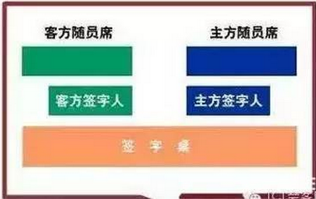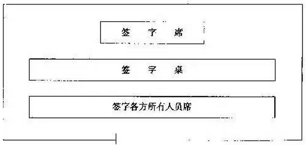 一般簽字桌橫放。簽字者面門而坐,賓右主左。參加者列隊站在簽字者之后。中央高于兩側,右側高于左側。