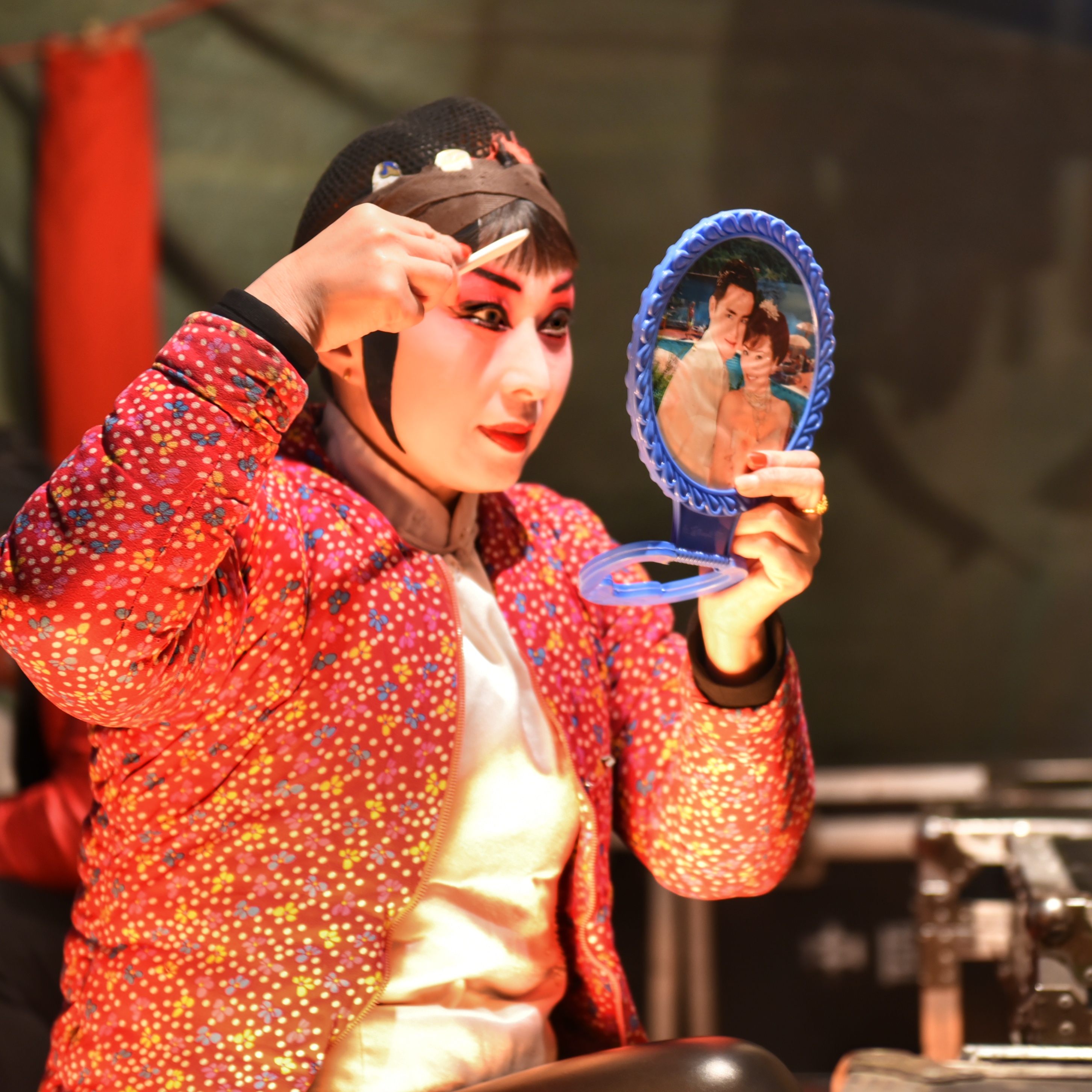 童年的記憶中我們這些頑皮的孩子,也不會(huì)依偎在父母的身旁去看、去聽自己不懂的戲曲,忙碌的后臺(tái)倒是吸引著我們的好奇心,演員的化妝、上臺(tái)前的準(zhǔn)備、五顏綠色的戲服、一張張的大花臉,都是那么的新奇、好玩。當(dāng)然此刻的我們還是那么的好奇,只是現(xiàn)在的手中多了一部單反。
