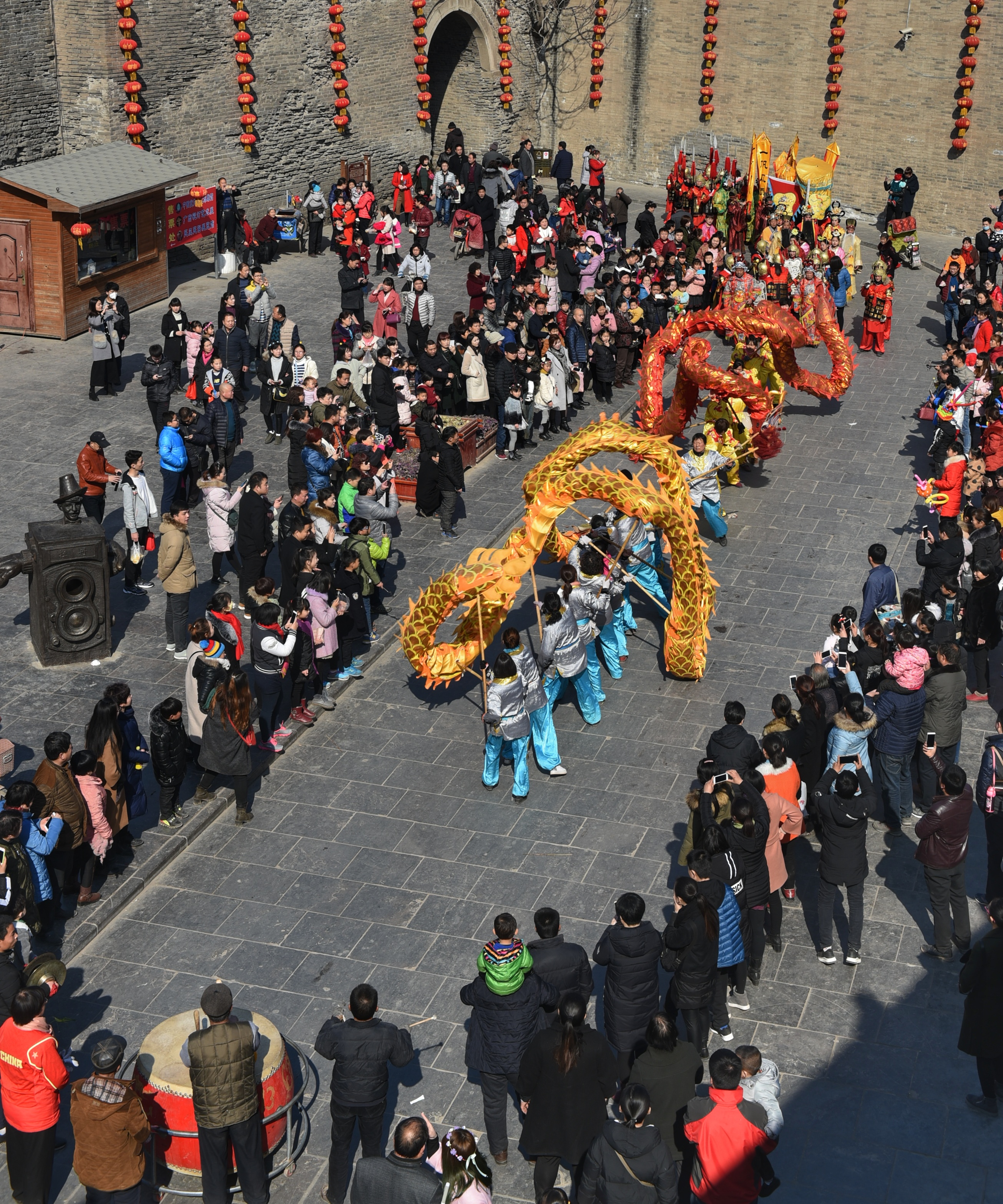 正徜徉在大街上的時(shí)候,被一陣鑼鼓聲吸引到了東門,原來是舞龍的隊(duì)伍,兩條巨龍?jiān)阼尮穆曋猩舷买v飛,舞出了一番盛世景象。